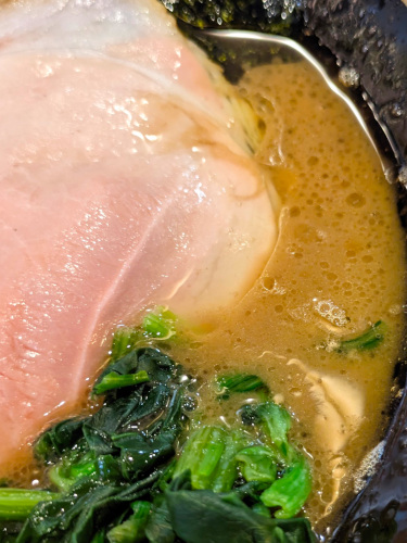 ガッツリとパンチのある醤油ダレの塩気と豚骨の旨味、鶏油のコクがハイレベルにまとまっており、燻製チャーシューも大きく厚みがあって生のほうれん草もたっぷり。