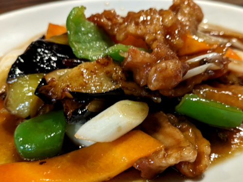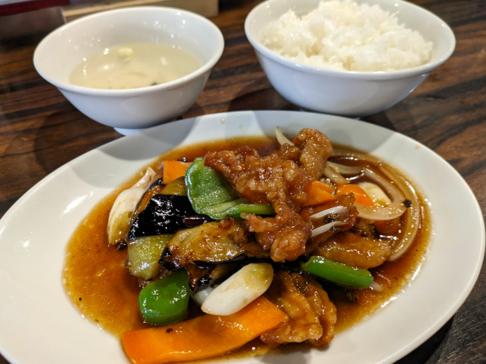 この日の日替わりセットのメニューは、豚肉とナスの四川炒め。てっきり麻婆茄子のような料理が出てくるかと思ったら、焦がした鷹の爪とホールの花椒が甘酸っぱい餡に入った、麻辣風味の酢豚が出てきてびっくり。