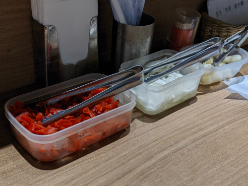 昔と変わらず、卓上には福神漬けと玉ねぎのピクルス、らっきょうがあって取り放題。