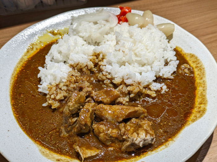昔はチキンの素揚げが乗ったチキンカレーが700円ぐらいで食べられたのですが、今はさすがに値上げして1020円になっています。今回はちょっと節約して750円の牛すじカレーにしてみました。