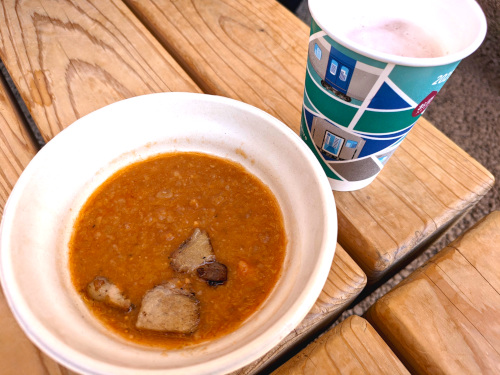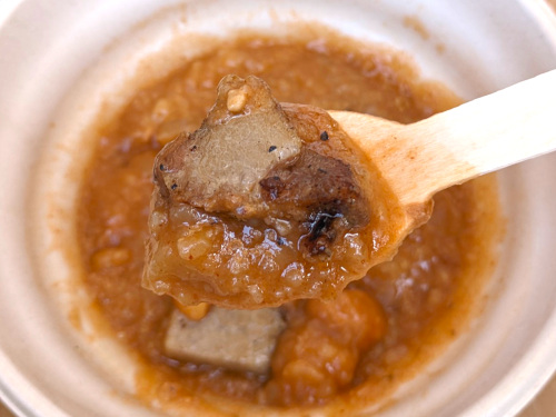 ポクポクとした乾燥ポテトが濃いめのトマト味でピリ辛のシチューで煮込まれ、上に載った豚バラ肉の角切りが、スモークで味が凝縮されて美味しいです。ボリュームはやや少なめなので、なにかパン系のものと一緒に食べたほうが良いかも。