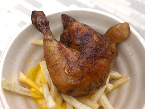 こちらは別の日にいただいた、ポジョ・ア・ラ・ブラサ(鶏肉の炭火焼)。スパイスが効いていて、黄色いマヨネーズソースを付けて食べるとこれまたビールに合いますよ!