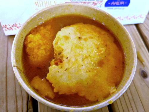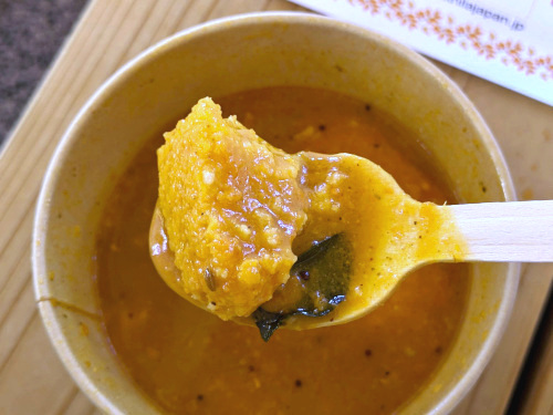 でもサンバルは辛味と酸味がビシッと効いていて、カレーリーフやドラムスティックが入った本格的なスタイル。ちょっと全体的に香りが弱いので冷凍品かもしれませんな。