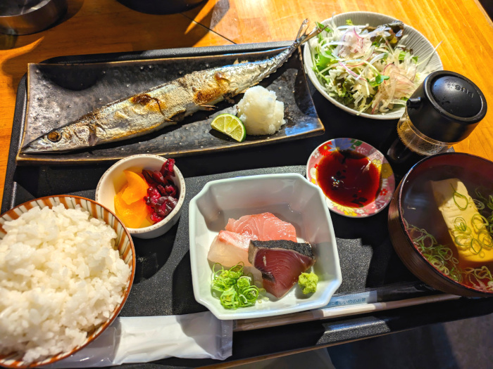 注文から焼き始めるのでしばらく待ちましたが、ようやく今年のサンマにありつけました。前のバージョンに比べると刺し身の内容が豪華になってサラダもついたので、まあこの値段は納得ですな。