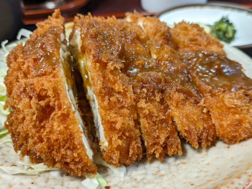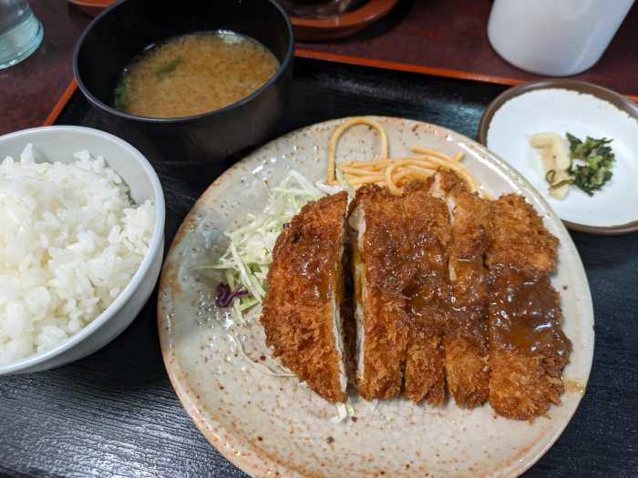 今回は一番安い600円のチキンカツ定食をオーダー。サクサクとしたチキンカツは大人の手のひらより少し小さめですが、厚みは1cm以上はあって食べごたえは十分です。ご飯に合うトマトグレイビータイプのドミグラスソースもちょっぴりかかっています。