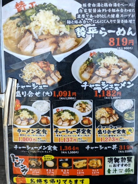 メニューにはライス+キムチ、チャーシュー丼、卵かけご飯などのセットもありますが、賛平らーめんの単品(900円)をオーダー。