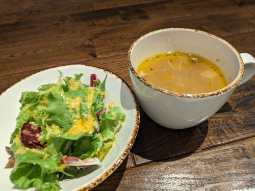 まず最初にサニーレタスのサラダと、ベーコンと人参、玉ねぎなど野菜の角切りが入った具沢山のコンソメスープ。ドレッシング、スープともに丁寧に作られていて美味しい。