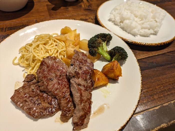全部平らげたら腹パンパン、値段は高めですが十分価値があるランチでした。ただ欲を言えば、ステーキも付け合わせも全部塩味なので、ステーキソースのような味変アイテムが欲しかったかな。