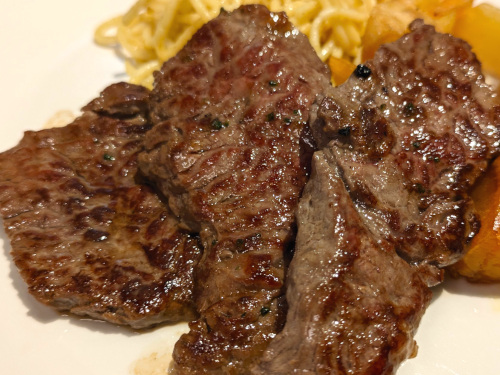 そして登場しましたハラミステーキ。ハラミは厚みのあるものが3枚、150gぐらいはありそうです。