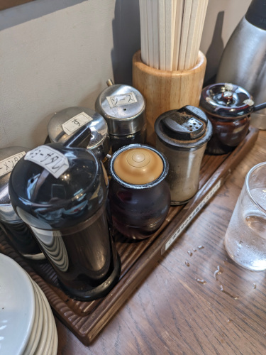 卓上にはソース、餃子のタレ、ラー油、一味唐辛子、辛子味噌が置いてあります。