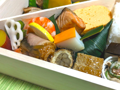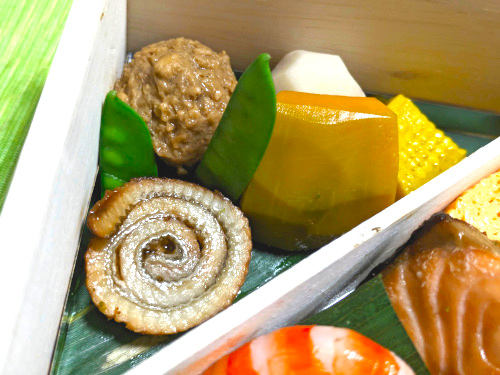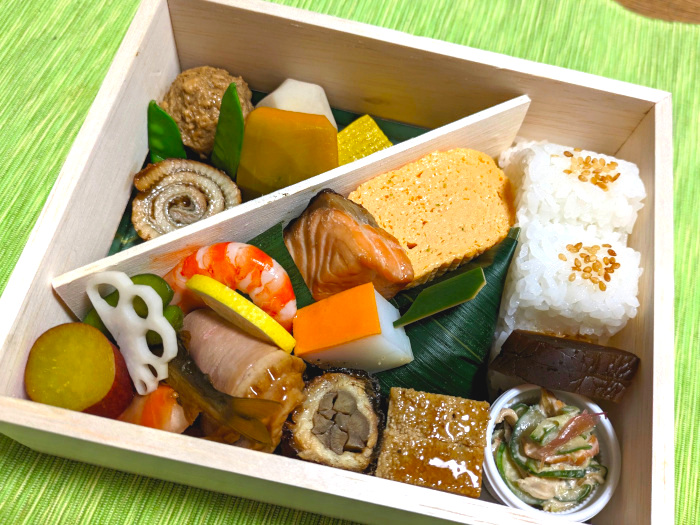 メインは、俵ご飯、鯛笹巻寿司、胡瓜胡麻和え(庄内麩、茗荷、椎茸)、出汁巻玉子、鶏松風、いか黄味焼、鰻八幡巻き、海老旨煮、サーモン幽庵焼、合鴨ロース、スモークサーモン大根巻き、稚鮎山椒煮、枝豆、紅芋蜜煮、酢蓮根、奈良漬。