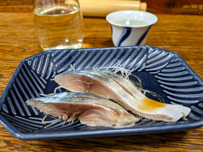 まずは明治屋を代表するメニューであるきずし。浅めに浸かった上品な味わい。ここはビールではなく、ガラスのお銚子に入った川亀の樽酒を燗で行きます。