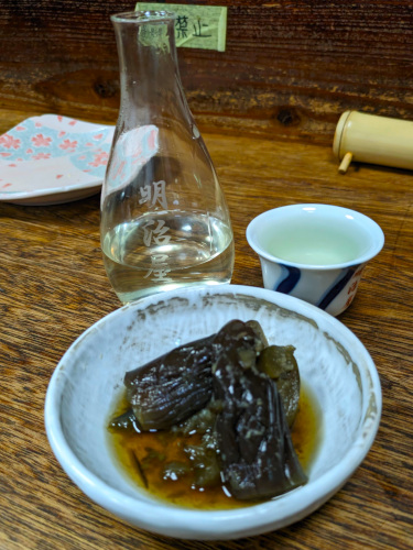 お酒をおかわりしてナスの生姜煮。こちらは甘めにこっくり煮付けられた一品。