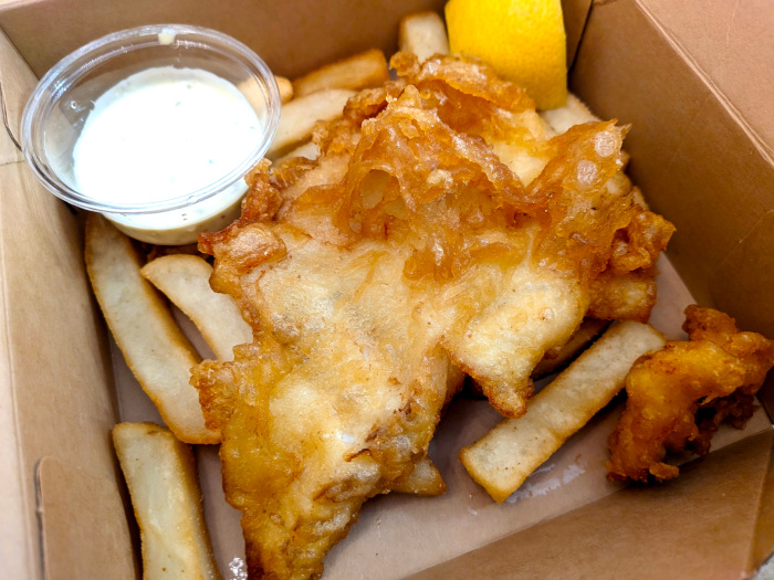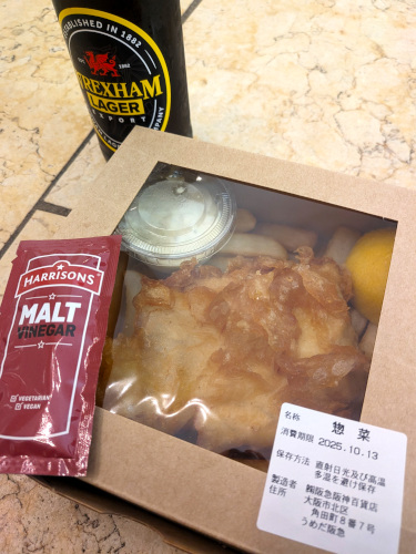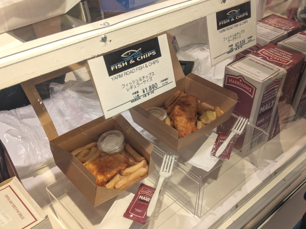 万博の英国館でもフィッシュ・アンド・チップスがテイクアウトで売られていたのですが、フルサイズしか無くてボリュームが多そうで結局買わなかったんですよね。こちらは小さめのレギュラーサイズ(1890円)が用意されているので、ビールと一緒に購入。