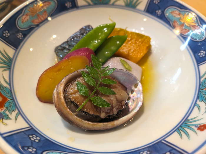 炊合せの内容は、とこぶし、茄子、さつまいも、かぼちゃ、きぬさや。甘めの出汁と柔らかく煮込んだとこぶしが実に美味。