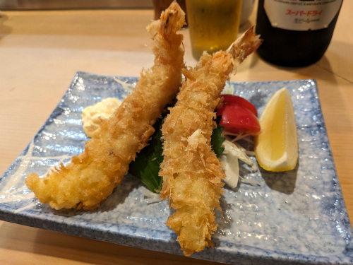 まだビールが残っているのでエビフライ。海老がぶっとく火の通りもミディアムで上々の出来。