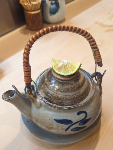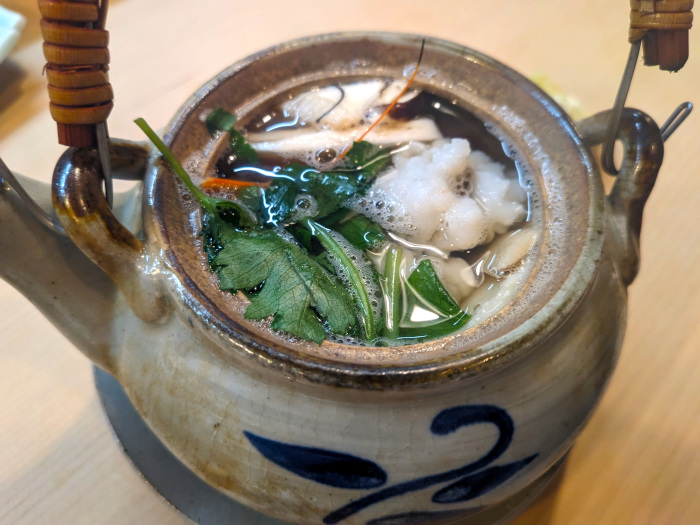 次はいつもの熱燗にスイッチ、湯豆腐にしようかと思ったのですが、メニューを見ると松茸の土瓶蒸しがあったので迷わず選択。