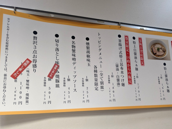 メニューは特上醤油らぁ麺、特上白醤油らぁ麺、昆布水つけ麺の3種類。ひとまずデフォルトであろう特上醤油らぁ麺(1600円)をオーダーしました。