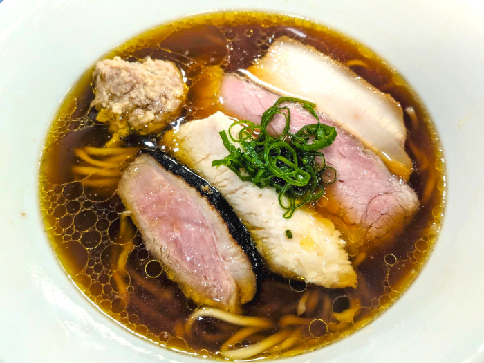 スープは、鶏ベースに貝や牛テール、日本酒を合わせた重層的でふくよかな味わい。麺はツルツルとした多加水の中細平打ストレート。