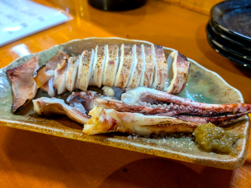 まるまる一杯で出てきた鯣烏賊の塩焼き(500円)。もちろん2杯目の酒、手取川を追加しましたよ。