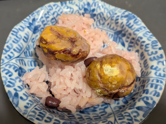 渋皮のついた丹波栗はホクホクで甘すぎず、ごま塩を振りかけた赤飯と一緒に食べると、これが意外と日本酒に合うんですなあ。