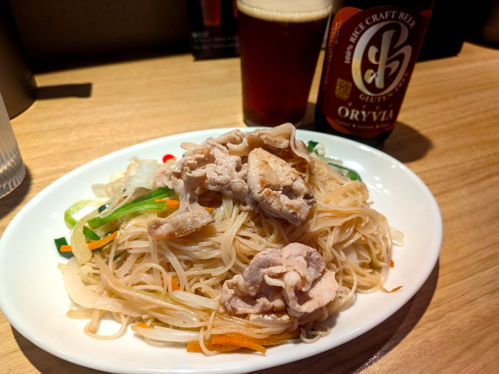 メニューを見ると、1杯2600円(!)でグルテンフリーのラーメンが並んでいますが、半額以下の1200円でGF焼ビーフンというメニューがあったのでそっちを頼みました(笑)。もちろんビールも頼んだのですが、ORYVIAというグルテンフリーのライスビールで1杯1200円でした・・・