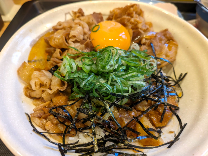 コンボ牛めしはこんな形で登場。御飯の上には刻み海苔が敷き詰められ、上には刻んだ青ネギがかけられています。表面の1/3がゴロチャーシュー、2/3が牛めしの具という感じ。そして生卵にはセパレーターが付いているので、黄身だけを使って丼に載せました。