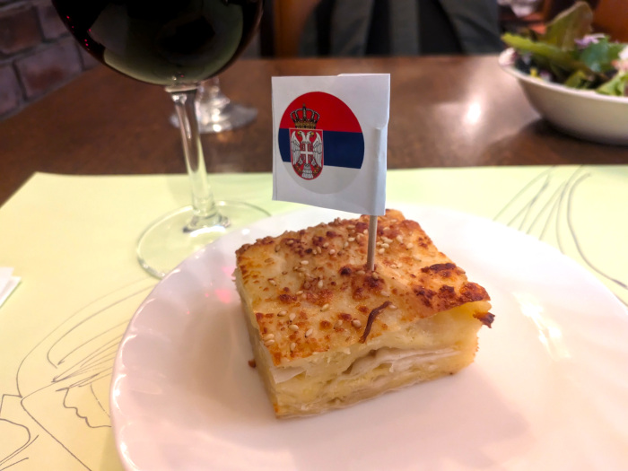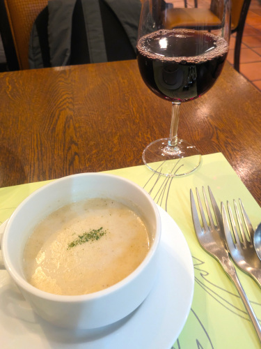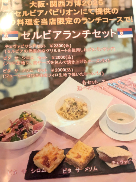 店内でいただけるのは、スープとサラダ、パスタのコースにセルビア料理から1品がプラスされる「セルビアランチ」(2000円)とグラスの赤ワイン。単品で、これも万博にあったヨーグルトサラダもオーダー出来ましたが自分はパス。