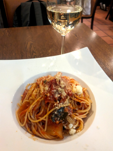 パスタは野菜とベーコンのトマトソースで、ズッキーニなどの野菜が甘くてソースもさっぱりとした酸味でヘルシー。2杯目の白ワインを飲み干してフィニッシュ。