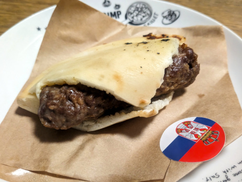 万博でチェヴァピ単体ではいただいてましたが、サンドイッチのほうは食べていなかったので、テイクアウトでいただきました。粗挽き肉で肉肉しいチェヴァピと、ピタパン、甘めに味付けされたキャベツが良いハーモニー。
