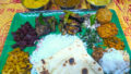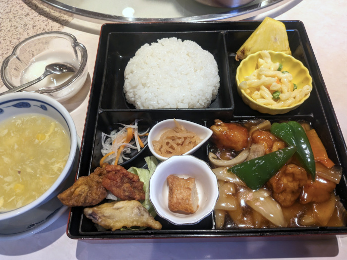 日替わりの定食は酢豚がメインで、魚の天ぷらやから揚げ、練り物、酢の物、切り干し大根、マカロニサラダ、パイナップル、コーンスープ、杏仁豆腐と非常に盛りだくさんの内容。