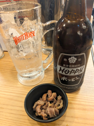 まずはホッピー白と、前回のレシート提示でもらえる小鉢。小鉢は鶏肉の小肉でした。