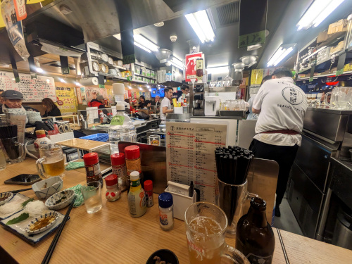 店はロの字型のカウンターで、外にテーブルもあってかなりのキャパシティですが、休日の夕刻頃に訪れると既にお客さんでほぼ満員状態。