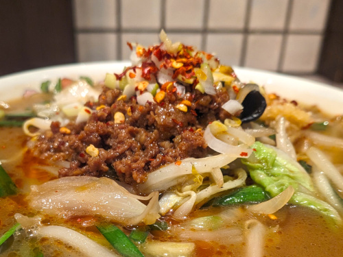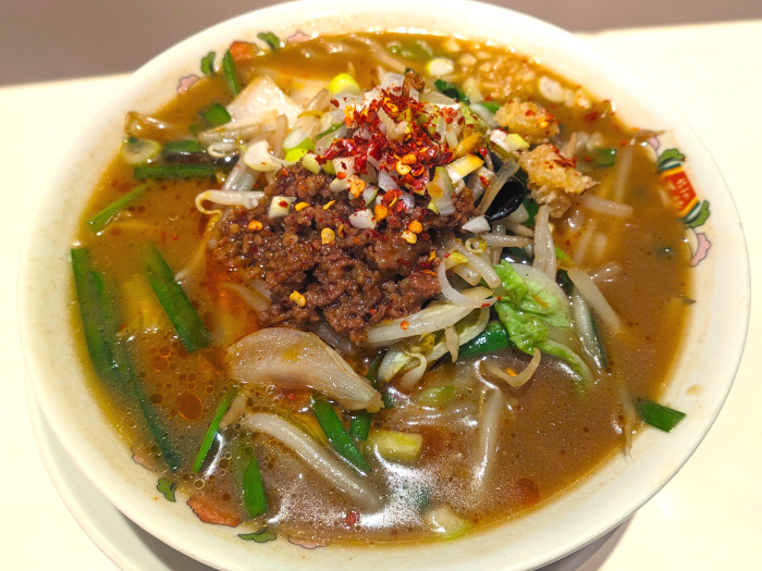 さて登場しました辣菜麺、「厳選ブレンドの味噌ベースに、四川山椒と香味辣油が効いた、野菜たっぷり薬膳仕立てのラーメンです」と説明にはありますが、山椒とラー油を効かせた麻辣のパンチは鋭いですが、味噌が意外と甘くて五香粉の香りも感じられ、なかなか複雑な味わいです。