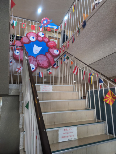 会館の2階に海外のブースがあり、階段では巨大な手作りミャクミャクがお出迎え。