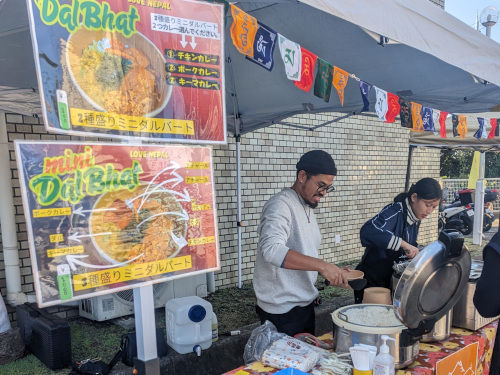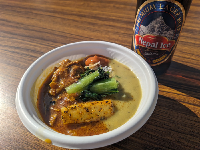 会場の外にはキッチンカーなどの屋台がありましたが、その中に万博でネパールパビリオンのスタッフとして働いていた方が営んでいる「LOVE NEPAL」というお店があったので、一番小さな1種盛りのミニダルバート(500円)と、ネパールアイスビール(500円)をいただきました。万博値段ならこの3倍は取られるとこですな。