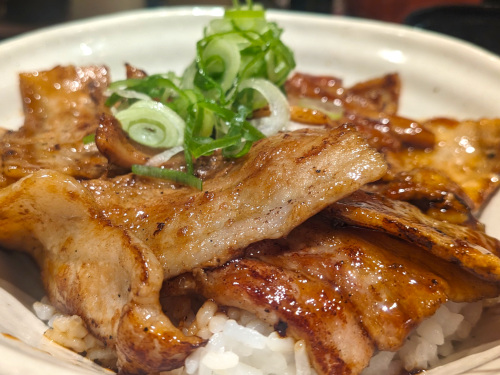 ご飯の上には、焼いた豚バラ肉が2層に渡って敷き詰められて相変わらずの迫力ですが、肉の厚みが去年と比べると少し薄くなった気がします。まあ、分厚いとかえって顎が疲れてしまうので、これぐらいで個人的にはちょうど良いかもしれません。