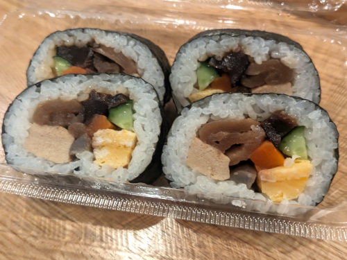 食堂の脇に冷蔵ケースがあり、だいこんさんが買った巻きずしのお裾分けをいただきました。これも具沢山で美味しい。