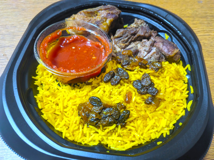 ターメリックの色に染まったバスマティライスは、香り高くパラパラですがラムスープの脂を吸って少しオイリーな仕上がり。甘酸っぱいレーズンがちょうど良い口直しになってますな。