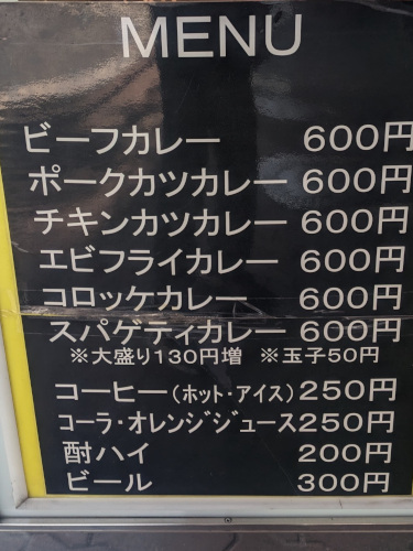 カレーの値段は、ビーフカレーもポークカツカレーもエビフライカレーも全て600円と激安! 過去のデータを見ると18年前でも580円だったので、たった20円しか値上げしてません・・・(@_@;)