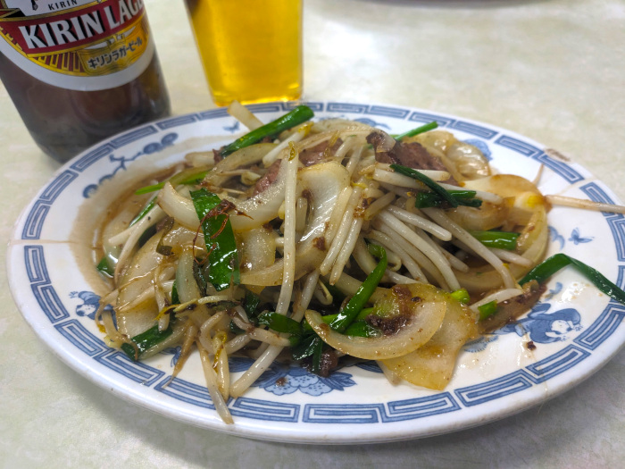 レバニラはあっさりとした醤油味で、野菜はシャキシャキ、レバーは少し臭みがありましたがビールが進む美味しさ。