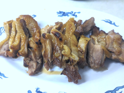 焼鳥もも・カタイは、親鳥のモモ肉を焼いて薄く刻んだもので、ゴリゴリの硬さで歯が疲れますが、噛めば噛むほど旨味が染み出て来ます。