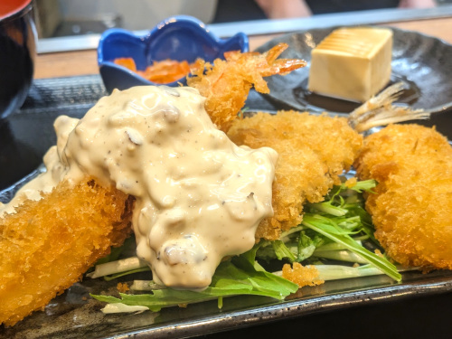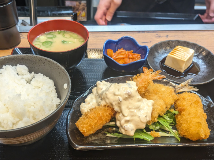 エビフライはプリプリで甘く、アジフライは肉厚なのにサクサクで軽く、クリームコロッケは中がとろりとクリーミー、いずれも手作りで美味しいです。自家製タルタルソースがこれでもかとぶっかけられているのも嬉しいポイント。