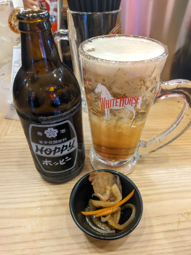 まずは前回のレシートでもらえる小鉢。今回は魚の南蛮漬けでした。そしていつものホッピー黒。