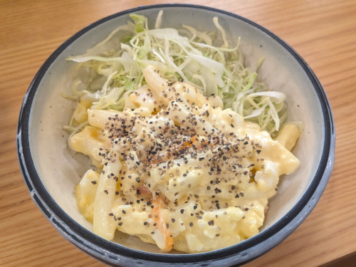 器にどっさり入ったマカロニサラダ(160円)は、玉子が入ってクリーミー。