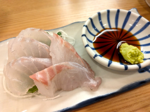 今日の刺し身は、旨味たっぷりの大阪産スズキ(250円)。