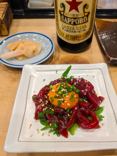 まずはアテから天然本マグロの赤身ユッケ。上等なマグロを甘いユッケのタレで食べる背徳感がたまりません。