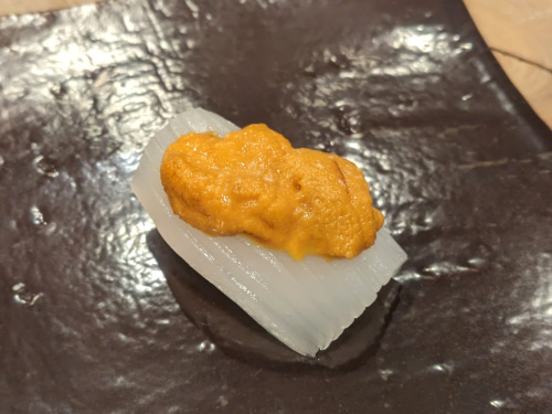 いつもの5貫おまかせは、定番のイカのウニ載せ。今回はいつもよりウニが巨大で思わず瞠目。