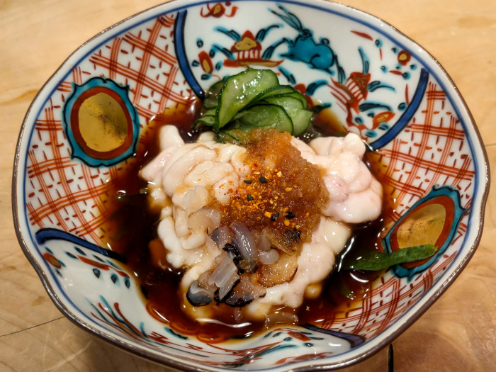 タラの白子ポン酢。これが今までの人生でいただいた中でNo.1といえるレベル。全く臭みが無くて皮の存在がほとんど感じられない。上品な甘みと旨味だけを舌の上に残して消えていきます。