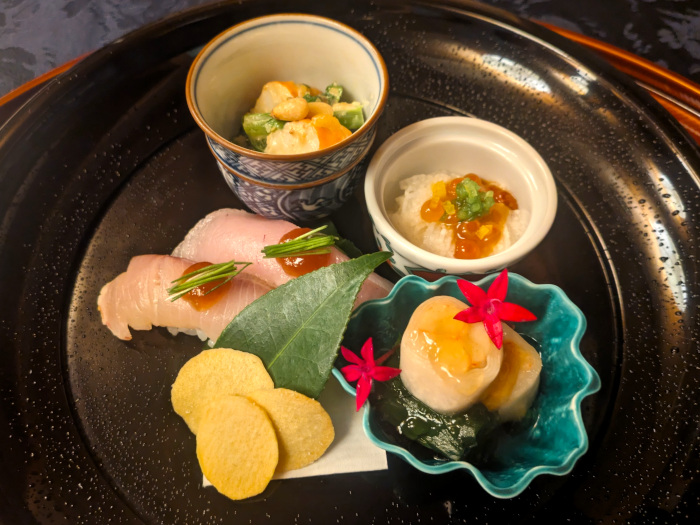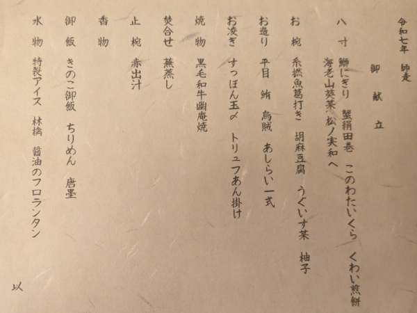ハ寸:飾にぎり 蟹絹田巻 このわたいくら くわい煎餅 海老山葵菜、松ノ実和へ